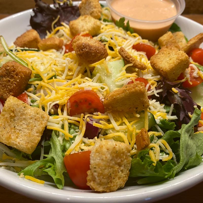 Spring mix, romaine, cherry tomatoes, red onions, and cucumbers